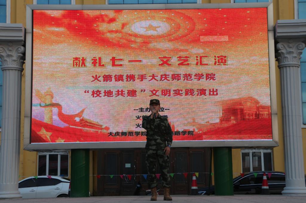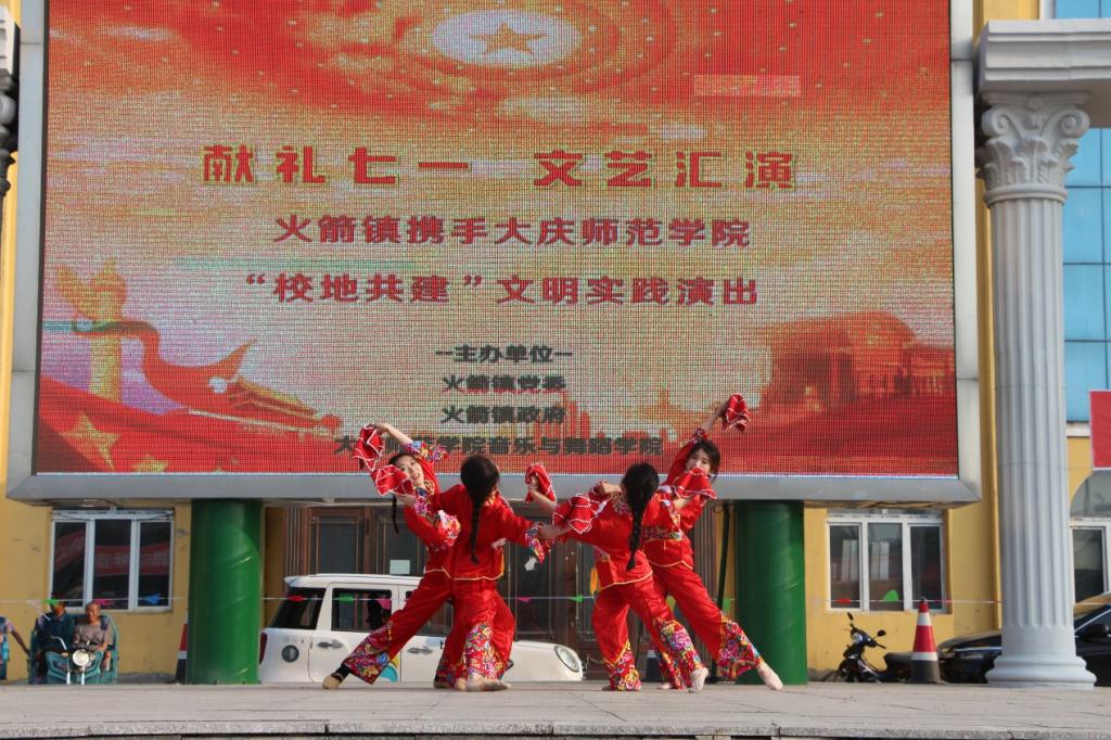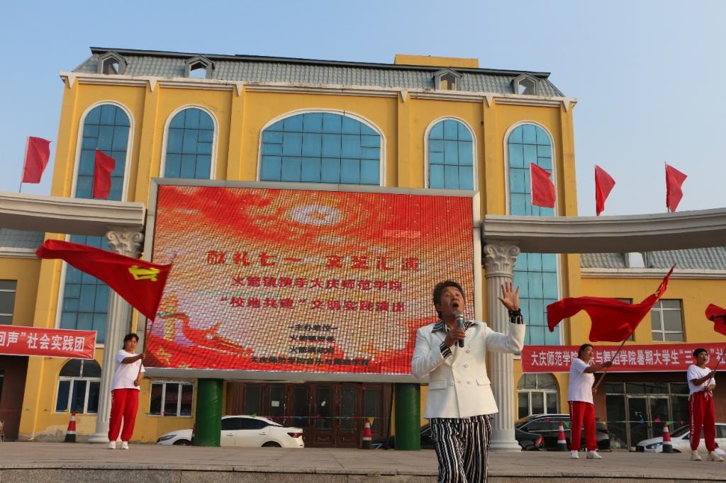 7月3日下午16点,团队成员到达望奎县火箭镇,在经过短暂的休息调整后,同学们不辞辛苦,在傍晚五点与正兰三村的演员们一起为当地的村民呈现了一台精彩纷呈的文艺演出。演出由秧歌《张灯结彩》拉开帷幕,伴着欢快的音乐和优美的舞蹈,全场的气氛被瞬间活跃起来,接下来独唱《不忘初心》、古筝独奏《荷塘月色》、独舞《九儿》、非洲鼓独奏《安河桥》、双人舞《桃花灵》、独唱《祖国不会忘记》、独唱《追寻》等把晚会推向了高潮,最后,演出在我院挂职干部沈天磊老师的带领团队成员合唱《歌唱祖国》中落下帷幕,本场演出得到了火箭镇党委和镇政府的大力支持,得到了在场村民的一致好评,大家一致表示演出的节目很精彩,非常接地气、开心。