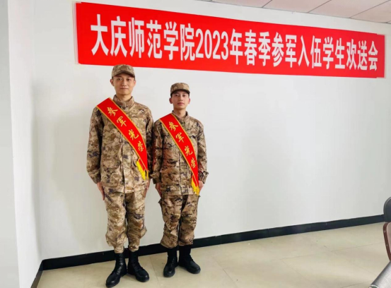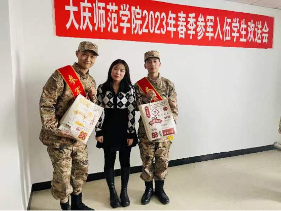又是一年送兵季,热血男儿赴征程。3月15日下午,我校举行了2023年春季应征入伍大学生欢送大会。音乐与舞蹈学院辅导员王鑫代表学院将爱心礼包送到刘子豪和陈鑫两名同学手中,并对他们寄予了深切的希望,希望他们珍惜身穿戎装的机会,牢记大庆精神铁人精神,把热血挥洒在实现强军梦的伟大实践之中,在军队这个大舞台上施展才华,在军营这个大熔炉里淬炼成钢,书写绚烂、无悔的青春篇章,希望他们到部队后刻苦训练、争当优秀士兵、争做合格军人、为军队现代化建设奉献自己的青春力量。