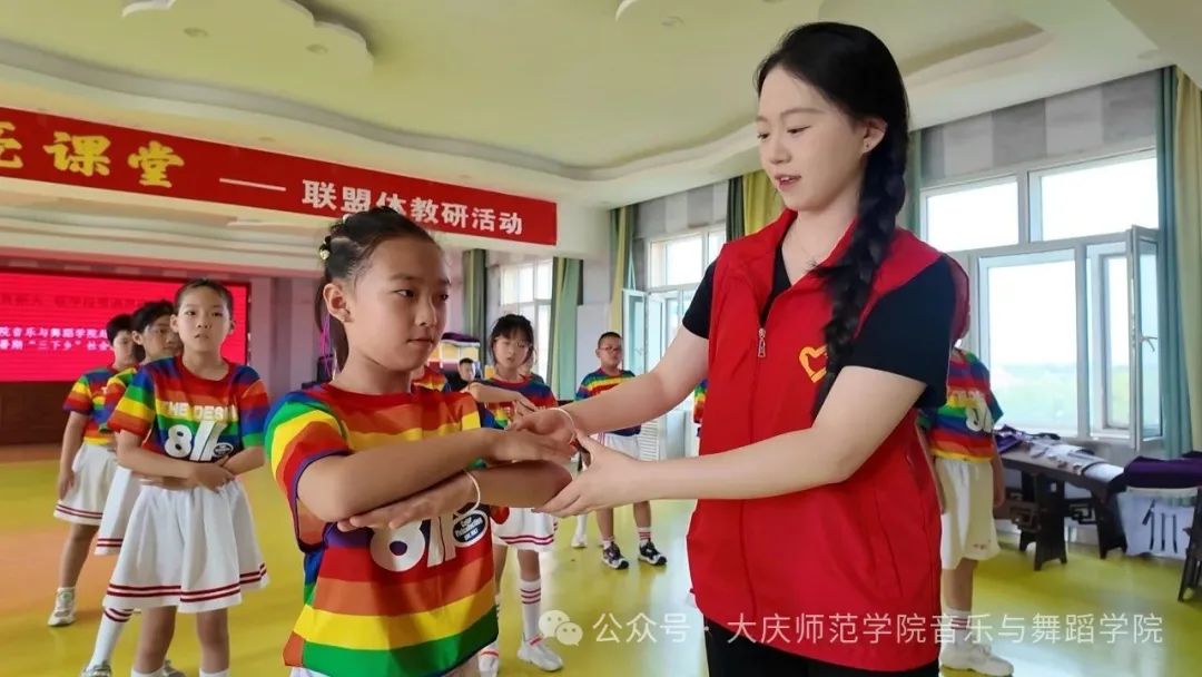 音舞交融润童心,思政美育共成长。6月30日上午,实践团队走进望奎县火箭镇火箭学校,以“大中小学思政一体化美育教育”为核心,开展了一场别开生面的美育实践活动,为乡村校园注入艺术与思政的双重活力。活动现场,团队成员充分发挥专业优势,精心设计了一系列融合思政元素的美育课程。在舞蹈课堂上,志愿者们耐心地指导孩子们学习基础舞蹈动作,从简单的肢体训练到富有节奏感的舞蹈组合,孩子们在欢快的音乐中舒展身姿,感受舞蹈艺术的魅力,在潜移默化中培养团队协作精神。音乐课堂上,志愿者们带领孩子们学唱《歌唱祖国》《踏着铁人脚步走》等经典红歌。教唱过程中,志愿者们不仅逐句纠正发音、传授歌唱技巧,还深入讲述每首歌曲背后的红色故事和精神内涵。当孩子们用稚嫩而坚定的声音唱响红歌时,爱国情怀与理想信念的种子也在他们心中悄然生根发芽。