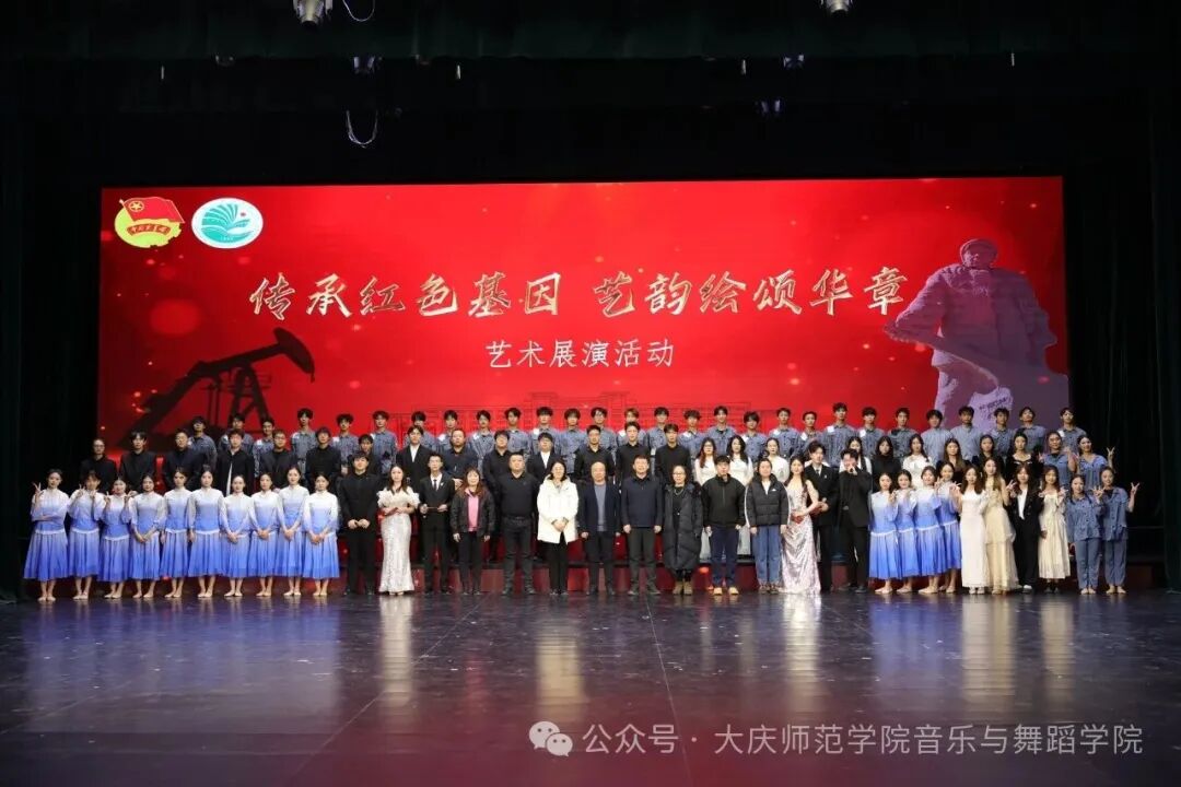 为进一步深入学习贯彻习近平新时代中国特色社会主义思想,落实党的二十大和二十届二中、三中、四中全会精神,丰富校园文化生活,引导广大团员青年坚定理想信念,传承红色基因,涵养家国情怀,深化大庆精神(铁人精神)育人实践。2025年11月24日晚,由校团委主办,音乐与舞蹈学院团委、美术与设计学院团委共同承办的大庆师范学院第十五届红色文化月“传承红色基因,艺韵绘颂华章”艺术展演在大学生活动中心成功举行。