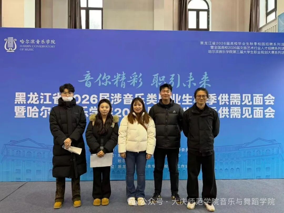 为进一步落实学校关于做好2026届毕业生就业工作的总体安排,全力推进我院2026届毕业生就业工作,精准对接行业优质资源,拓宽毕业生就业渠道。2025年11月29日,音乐与舞蹈学院党总支书记张雷、辅导员王鑫、袁佳宝和我院部分2026届毕业生前往哈尔滨音乐学院,参加黑龙江省2026届涉音乐类毕业生秋季供需见面会。