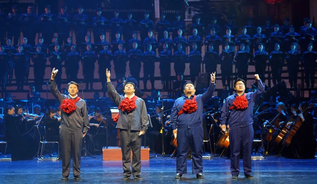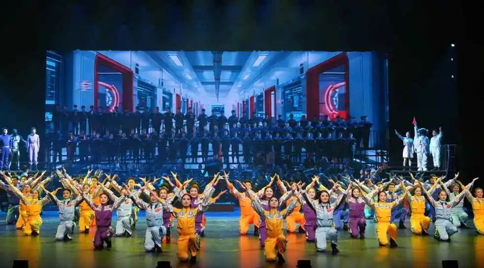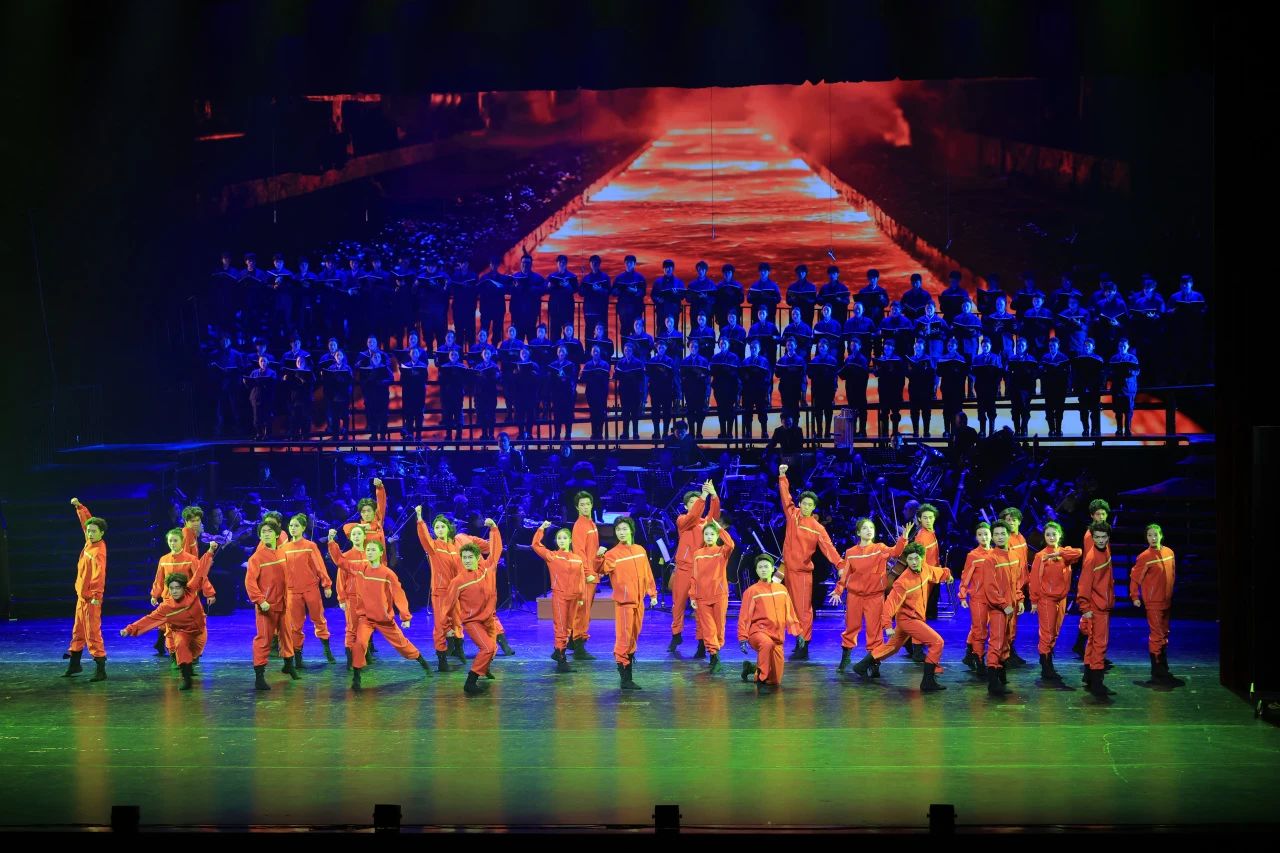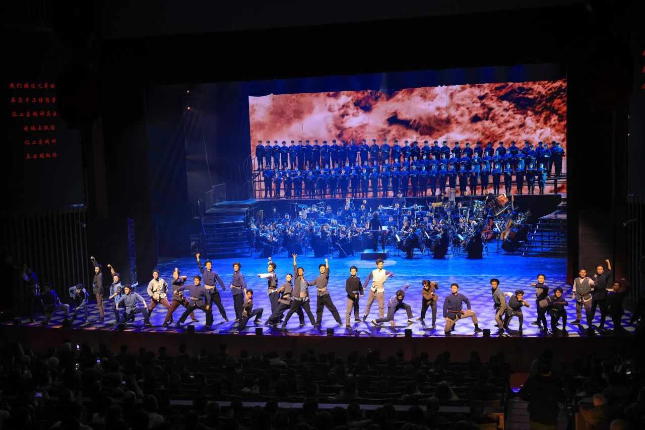 仪式结束后,历时一月之久的《大国脊梁·百年浩歌》大型原创交响情景剧在歌剧院首演亮相。此次演出以全国总工会成立100周年为契机,由大庆师范学院音乐与舞蹈学院与大庆文化体育旅游集团联合打造,集结了双方的优势力量,旨在深情回望中国工人阶级百年奋斗历程,展现中国近现代历史的波澜壮阔,传承和弘扬民族精神。音乐与舞蹈学院排除万难,精心挑选了一百四十余名师生参演,师生们几十天的排练虽然辛苦,但也锻炼了意志、打磨了技艺,整场演出震撼心灵,为观众带来了一场精彩纷呈的视听盛宴。