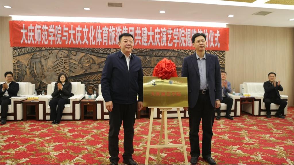 许双毅与郭泽斌代表双方签署合作协议。随后,双方共同为大庆演艺学院揭牌,标志着双方在演艺人才培养、文化产业发展等领域开启深度合作。