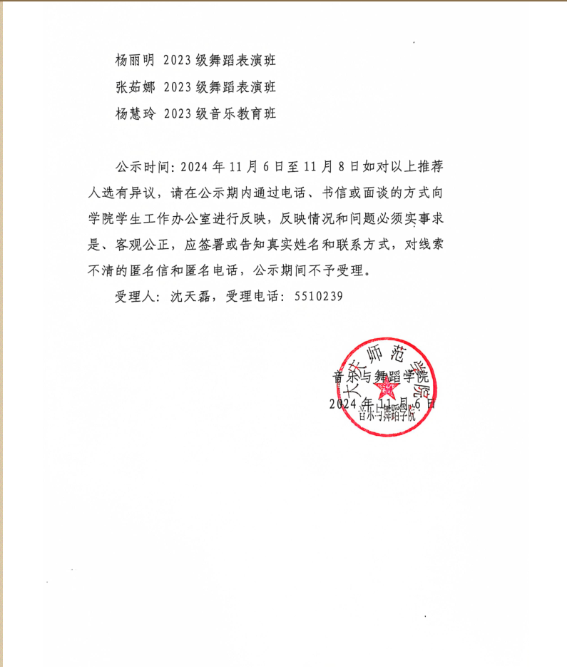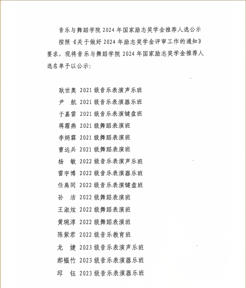 音乐与舞蹈学院2024年国家励志奖学金推荐人选公示
