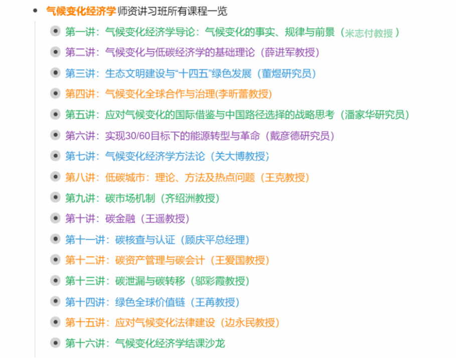 首届气候变化师资讲习班课程邀请国内外20位气候变化领域知名专家进行了16次课程讲习,内容涵盖气候变化经济学理论及实务,注重理论讲授和学术前沿,主题涉及气候变化科学认知、基础理论、方法论、国家战略与规划、全球气候治理与合作、低碳城市理论与实践、碳市场与碳金融、碳资产管理与核查、碳泄漏与碳转移、绿色全球价值链、应对气候变化法律建设等。单篇浏览量最高达20252次,总播放量达110000次以上。