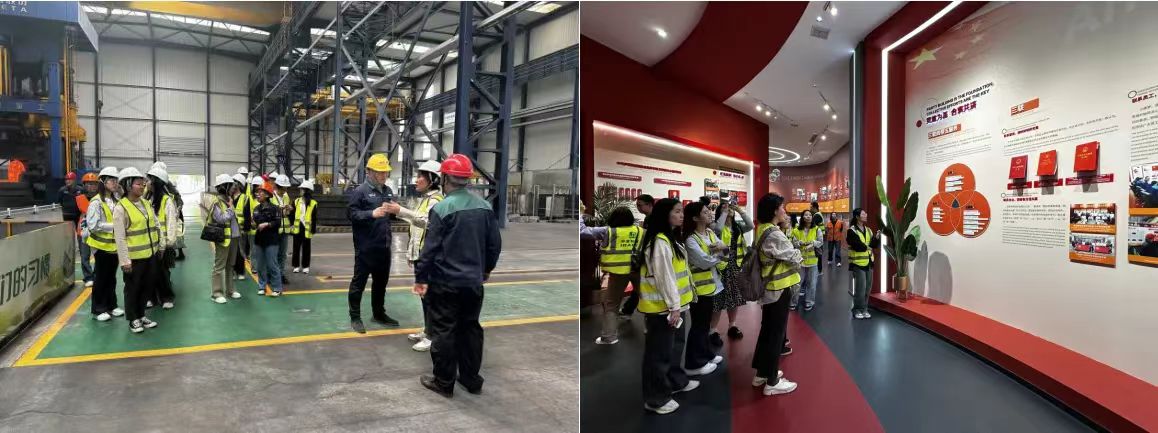调研最后一站是伊莱特能源装备股份有限公司。该公司专注于清洁能源关键部件制造,产品广泛应用于风电、核电等多个重要领域。公司在节能环保、设备升级和技术革新方面做了大量工作,并在全球范围内保持制造超大锻环的记录。伊莱特不仅在工艺和管理上求新求变,还通过CDP环境信息披露,分析代表性产品的碳足迹,为未来的绿色发展制定了详细规划。调研期间参观了锻造厂房、企业党建工作室,一行师生对企业发展理念和绿色低碳发展成就有了更深刻理解。