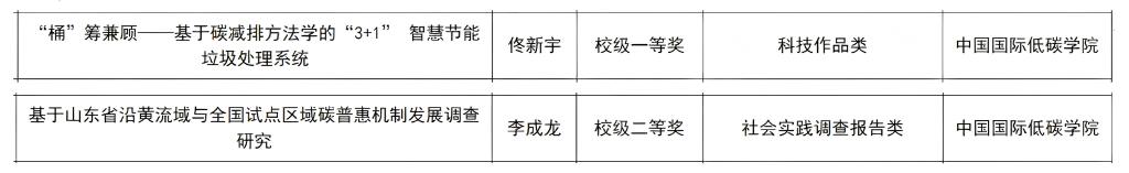 近日,第十八届全国大学生节能减排社会实践与科技竞赛校内选拔赛获奖名单公示。我院研究生佟新宇、李成龙负责的参赛作品《“桶”筹兼顾——基于碳减排方法学的“3+1” 智慧节能垃圾处理系统》《基于山东省沿黄流域与全国试点区域碳普惠机制发展调查研究》,分别荣获科技作品类校级一等奖以及社会实践调查报告类校级二等奖。
