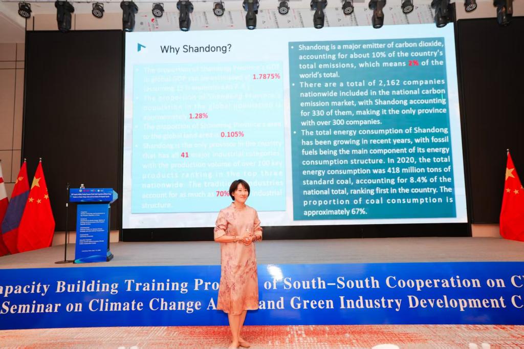 9月4日,我院王璟珉教授受邀在生态环境部主办的2025年“应对气候变化南南合作-应对气候变化与能源绿色低碳发展”研讨班上为来自南非、加蓬、埃及、冈比亚、智利、古巴、斐济、萨摩亚等16个国家的25位气候变化领域政府官员、专家学者和技术人员作了题为《山东:打造中国首个国家绿色低碳高质量发展先行区》的报告。报告中提到山东被国务院设立为全国首个绿色低碳高质量发展试点省,正以“1+N+X”政策体系为框架,通过淘汰落后产能、发展海上风电与氢能等高端产业,构建“风光储+CCUS”多元能源体系,并在青岛港、济南莱芜等地打造零碳示范项目;2024年已使碳强度下降9.2%、PM2.5下降46%,新增110万绿色岗位。依托300亿美元绿色债券和200亿元碳减排基金,山东与德国、丹麦、新加坡合作,并通过“南南三角实验室”向小岛国家输出分布式可再生能源、蓝色碳汇和绿色金融经验,证明重工业大省完全可以在经济持续增长的同时提前实现碳达峰,并为全球提供可复制的绿色转型路径。