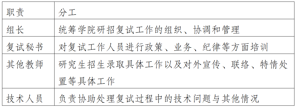 学院成立以院长为组长的研究生招生复试工作小组,负责研究生复试工作的组织、管理和具体组织实施。