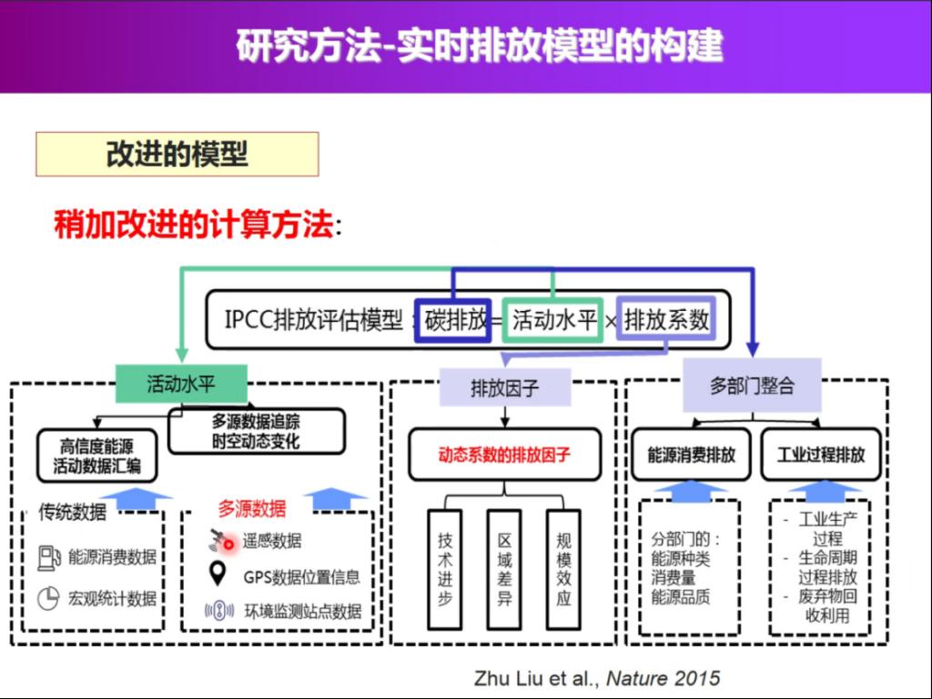 在研究背景方面,刘竹指出,碳排放的量化需要调查、测量、模拟和统计多个方面的综合,而当前的碳排放量化方法有明显的时间滞后性,现有的量化评估体系也有时效性差、分辨率低、计算参数不准、数据掌握发达国家机构中等缺点。因此,我们要进行全球碳排放量化与评估的方法创新,以此为研究目标,追求碳排放数据的时效性与完备性、高精度与高准度,做到及时准确、公开透明、满足国家需求。