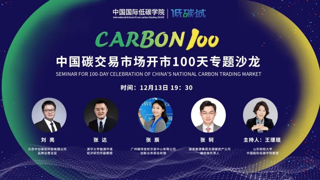 2021年12月13日是中国碳交易市场第100个交易日,在这个特殊的日子里,学院组织开展了CARBON100中国碳交易市场开市100天专题沙龙。此次沙龙邀请到了清华大学能源环境经济研究所副教授张达、国家能源集团龙源碳资产公司碳交易负责人张轲、中创探投科技有限公司品牌运营总监刘亮、广州碳排放权交易所创新业务部总经理张辰。沙龙由ok138cn太阳集团古天乐王璟珉教授主持。本次沙龙通过低碳城平台同步直播,观看人数达9.9万人次。