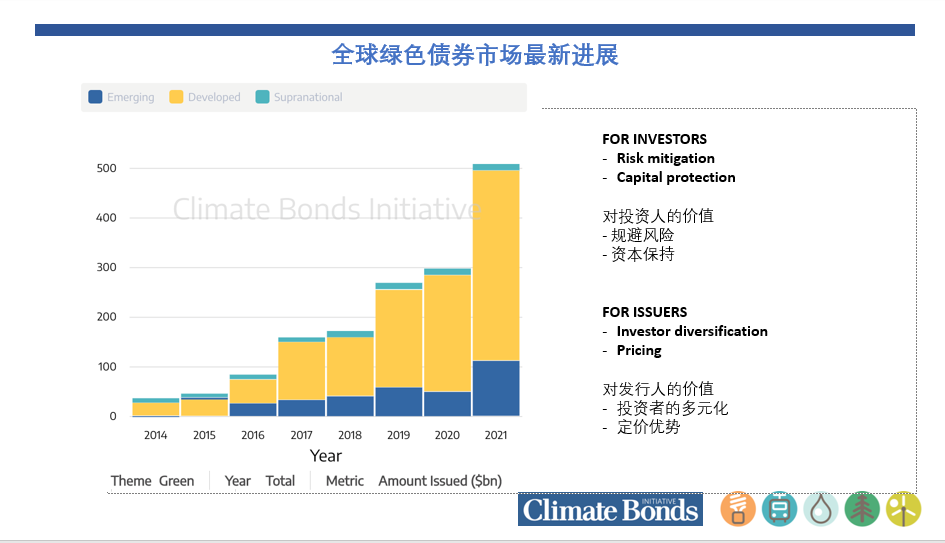 本次讲座,介绍了何为绿色债券、绿色债券的买方、为何要在气候变化中使用绿色债券、绿色债券有何好处,并用图示介绍全球绿色债券市场最新进展。