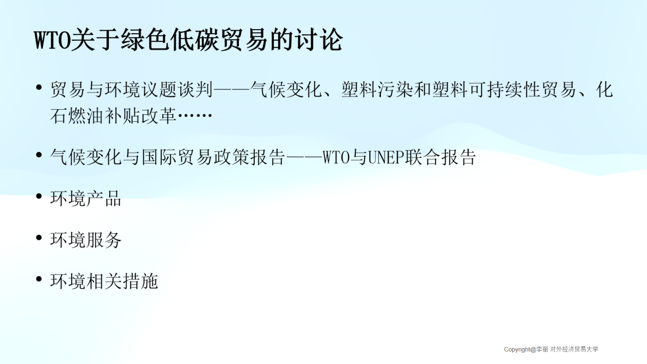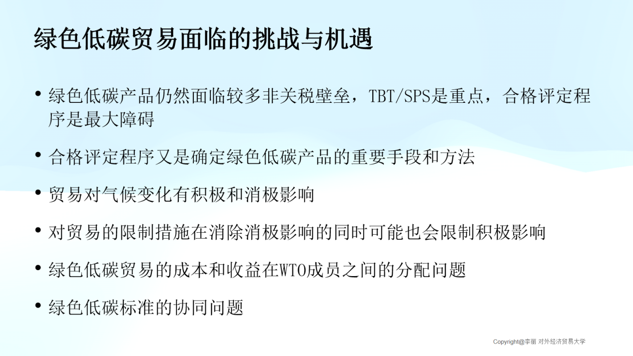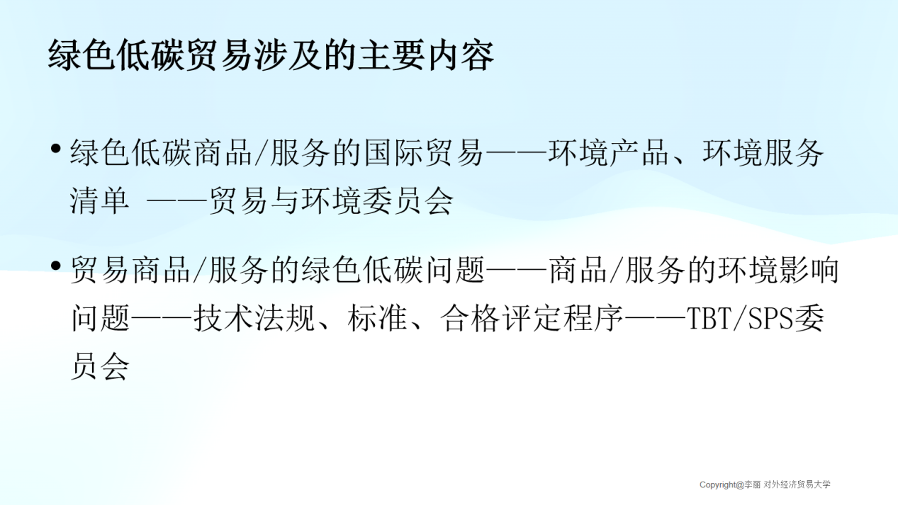 关于绿色低碳贸易涉及的主要内容。首先是绿色低碳产品或者服务本身的国际贸易,目前贸易与环境委员会正在讨论促进环境产品与环境服务清单的制定,所涉及的产品和服务是直接针对于解决气候变化与环境问题的。另一类是关于普通产品或服务的绿色低碳问题,更多关注商品或服务的环境影响,对商品或服务在生产过程或最终使用过程中产生的环境影响制定的规定。这些规定主要体现在技术法规、标准与合格评定程序。